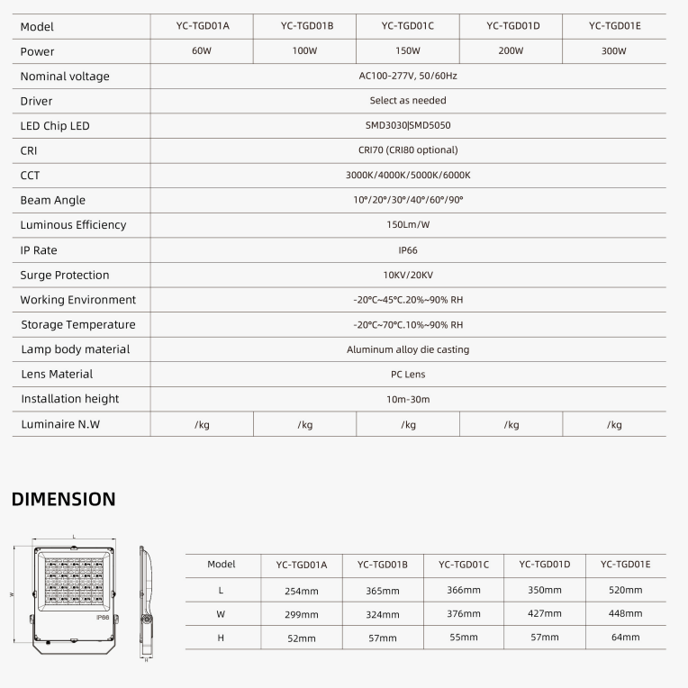 | YC-TGD01-50W | 358*294*52 | 50వా | Heat sink Aluminum body,Glass,Bracket,304 screws, PCB, లెన్స్. |