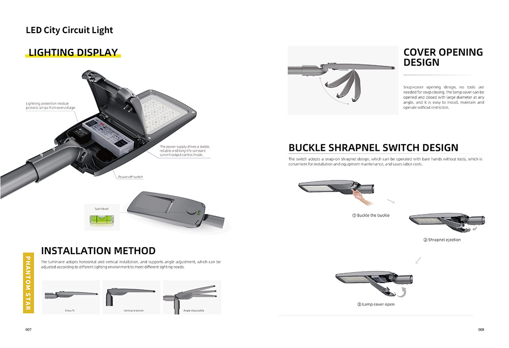 లీడ్ సిటీ రోడ్ లైట్ ష్రాప్నెల్ డిజైన్పై స్నాప్ను అవలంబిస్తుంది, ఇది సాధనాలు లేకుండా ఒట్టి చేతులతో ఆపరేట్ చేయవచ్చు మరియు ఇన్స్టాలేషన్కు సౌకర్యవంతంగా ఉంటుంది మరియు పరికరాల నిర్వహణ కార్మిక ఖర్చులను ఆదా చేస్తుంది.